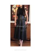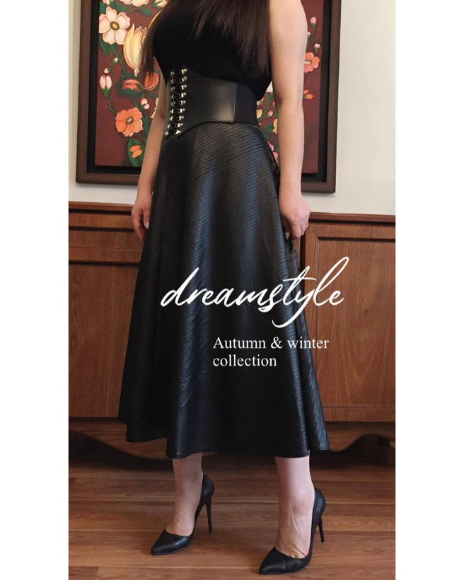 دامن چرم نيم كلوش جنس كار چرم نواردوزي روي تور آستردار و كمردار كمربند معمولي روي كار هست ،اين دامن در فصل بهار هم مورد استفاده هستش چون كار تلفيقي از تور و چرم هست